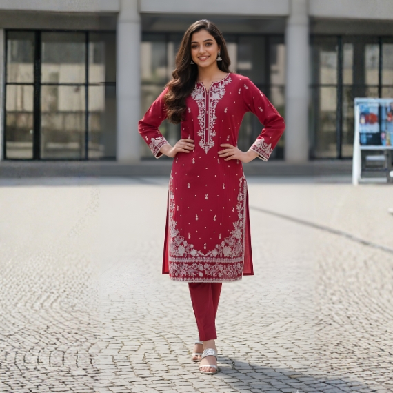 Made from soft, breathable fabric, the suit is tailored in a straight-cut silhouette that flatters all body types. Paired with matching trousers, it offers a complete, elegant look suitable for casual gatherings, semi-formal events, and everyday wear.