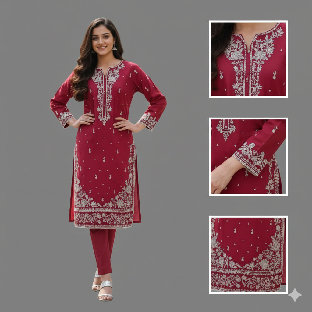Embrace refined tradition with this exquisite embroidered suit from Rang-E-Gulzar, designed to bring together comfort, style, and cultural charm. Featuring detailed embroidery on the neckline, sleeves, and front panel, this outfit radiates sophistication without compromising on comfort.