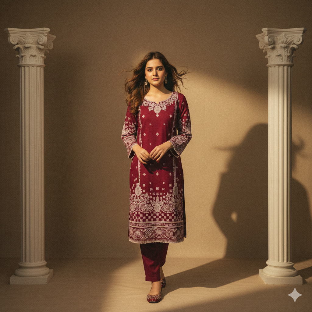 Embrace refined tradition with this exquisite embroidered suit from Rang-E-Gulzar, designed to bring together comfort, style, and cultural charm. Featuring detailed embroidery on the neckline, sleeves, and front panel, this outfit radiates sophistication without compromising on comfort.